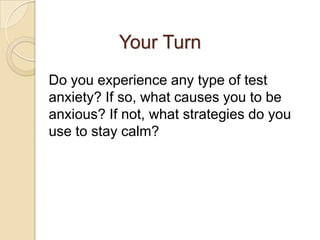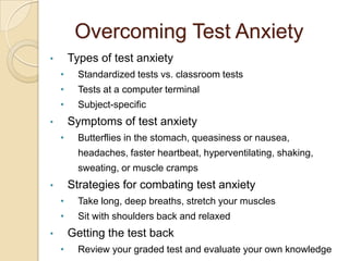 Test determines level of knowledge and. Deep Breaths Focus on your breathing to get your mind off the test Slide 28 Visualize Your Success While studying picture yourself in the classroom doing well on the test. The process of elimination B.